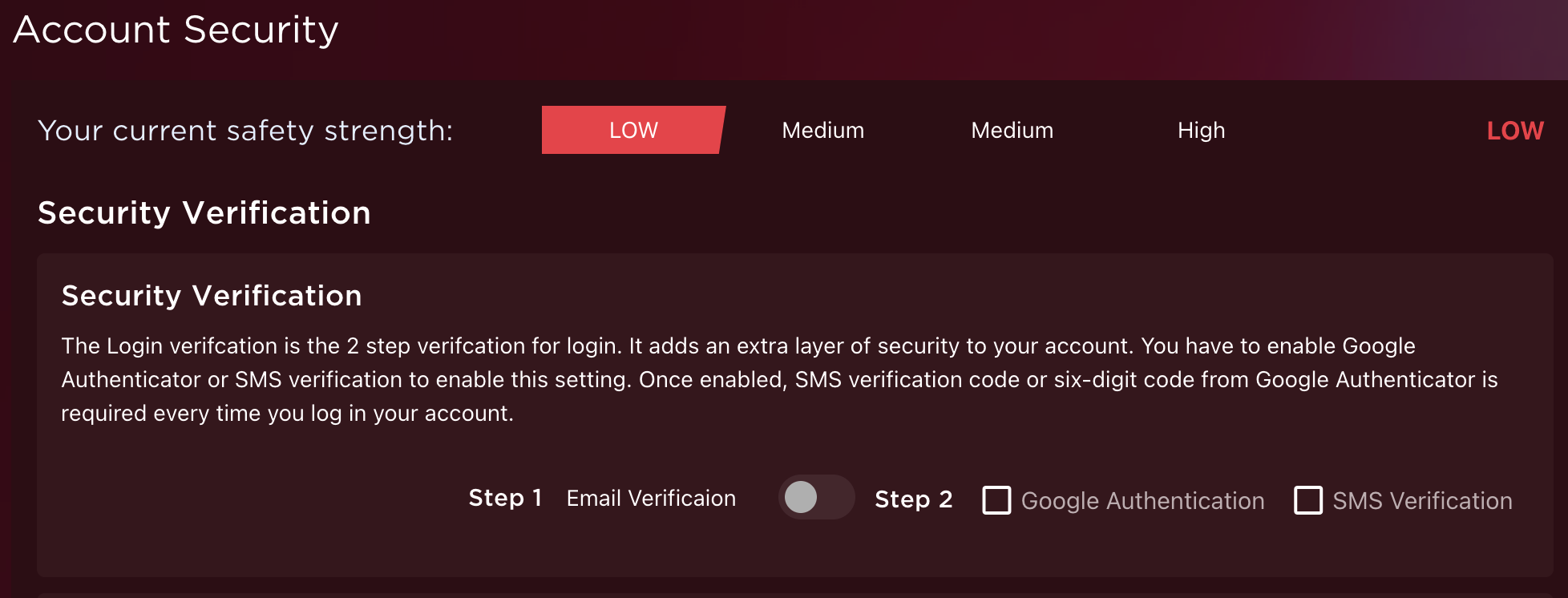 You can enhance your security by enabling Email Verification and either Google Authentication or SMS Verification